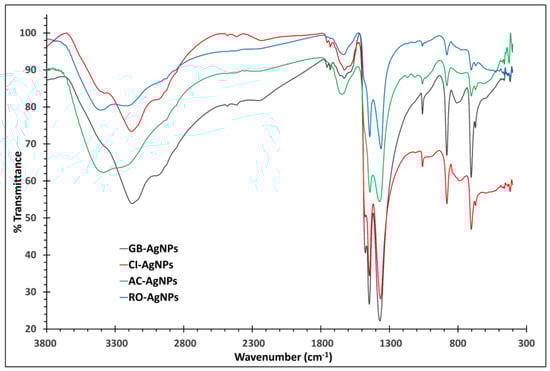 FT-IR images of GB-AgNPs, CI-AgNPs, AC-AgNPs, and RO-AgNPs.