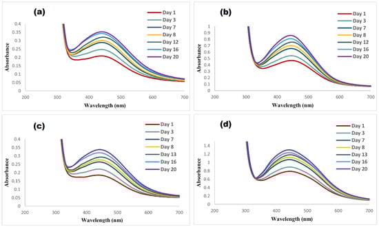 Reaction time is an important factor for synthesizing nanoparticles []. The results shown in Figure 8 indicate an increase in the absorbance with an increase in the reaction time, which correlates with an increase in AgNPs concentration in the solution []. In this study, 5 mL of 0.01 M AgNO3 were mixed with 7 mL of each extract (5:7 ratio). The maximum absorption was found on day 7. The wavelengths of the bands remained unchanged until day 8, where the wavelengths red-shifted, and the red-shift increased by increasing the reaction time. The shifting of the wavelengths of the AgNPs may be due to the increase in size and the aggregations of colloidal nanoparticles, along with the presence of high concentrations of stabilizing agents in the plant extracts [].