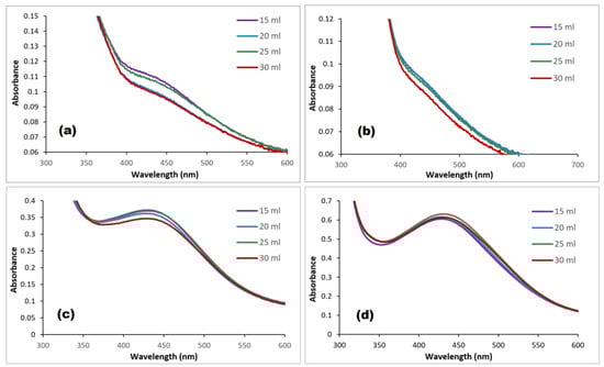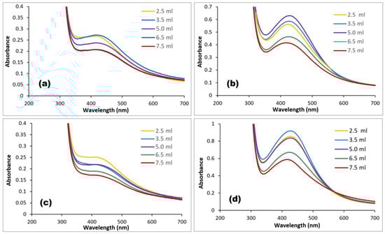 Effect of plant extract’s volume on the formation of (a) GB-AgNPs, (b) CI-AgNPs, (c) AC-AgNPs, and (d) RO-AgNPs.