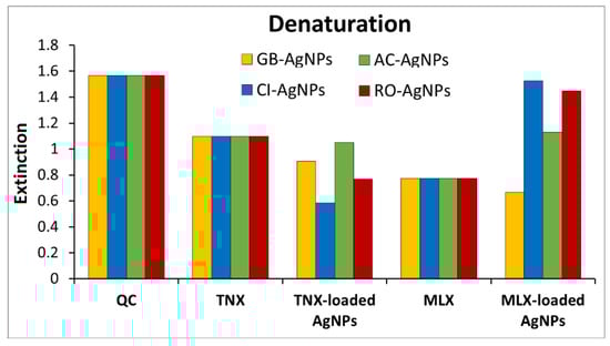 The anti-inflammatory activity of the green-synthesized AgNPs has been studied through the protein denaturation method. Protein denaturation is a process in which proteins (nucleic acids) lose their quaternary, tertiary, and secondary structures due to some external stress or compounds such as an organic solvent, concentrated inorganic salt, strong acid or base, agitation, and radiation or heat, which is the reason for inflammation []. Tenoxicam and Meloxicam (TNX/MLX) drugs reduce the denaturation under these stresses and cause an anti-inflammatory effect [].
