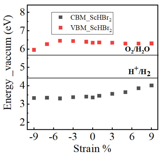 The calculated strain-induced variation in VBM and CBM positions with respect to the redox potential for the ScHBr2 monolayer.
