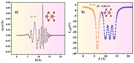 (a) Plane-averaged differential charge density () (b) Plane-averaged electrostatic effective potential (Ueff) along the z direction of the heterostructure.