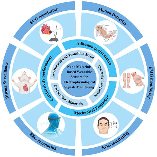 In this review, we discuss the recent research advances in nanomaterial-based hydrogel wearable sensors for electrophysiological signal monitoring from three perspectives, illustrated in Figure 1. In the first part, the classes of nanomaterials used to construct nanomaterial composite hydrogel for wearable sensors are discussed, including carbon nanomaterials, metal nanomaterials, and two-dimensional transition metal nanomaterials. In the second part, we summarize the main properties of hydrogel-based wearable sensors, including the electrical properties, adhesion properties, and mechanical properties. Next, the applications of hydrogel-based wearable sensors for electrophysiological signal monitoring are summarized, such as ECG, EMG, as well as EEG signals detection. Finally, a conclusion and outlook are given to the future development trend based on the current hydrogel-based wearable sensors, aiming at realizing a wider range of application scenarios for hydrogel-based electrophysiological monitoring sensors.