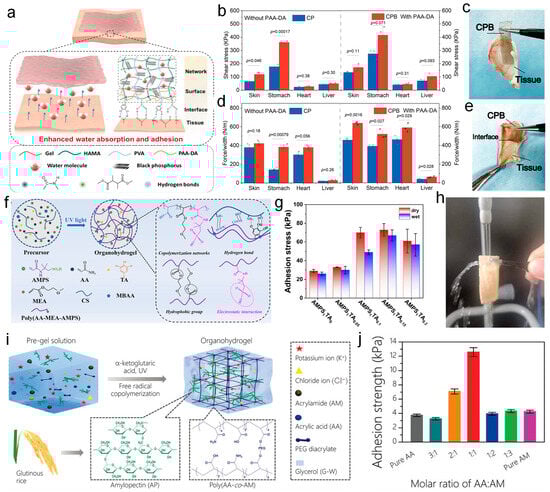 Adhesion properties of stretchable hydrogel wearable sensors. (a–e) Removal of interfacial water by adding black scale nanosheets, thereby enhancing the adhesion strength of hydrogel-based wearable sensors to various tissues [153]. (f–h) Enhancement of substance-to-substance interactions by introducing TA significantly improves the adhesion strength of hydrogel-based wearable sensors in harsh environments [154]. (i,j) Enhancement of adhesion strength of organic hydrogel-based wearable sensors by natural material starch [155].