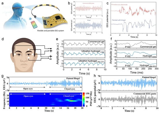- Wang, C.; Wang, H.; Wang, B.; Miyata, H.; Wang, Y.; Nayeem, M.O.G.; Kim, J.J.; Lee, S.; Yokota, T.; Onodera, H. On-skin paintable biogel for long-term high-fidelity electroencephalogram recording. Sci. Adv. 2022, 8, eabo1396. [Google Scholar] [CrossRef]
