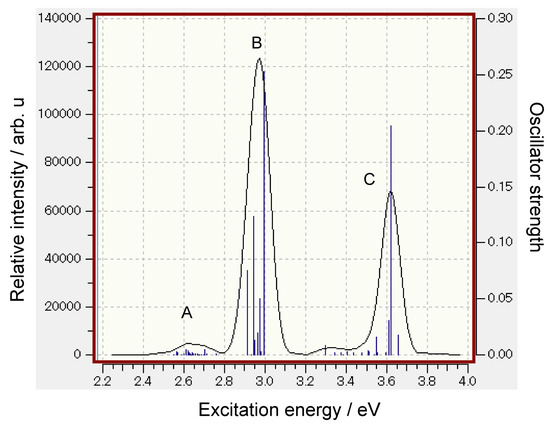 The simulated absorption spectrum of Thio-C60-PCBM is given in Figure 7. The absorption spectra are composed of three bands (A, B, and C). Band A is distributed in the range of 2.45–2.80 eV and is composed of 23 weak electronic excitations. The CTs from Thio to C60 and from C60 to PCBM were found at a lower energy region (2.56 eV: electron transfer, Thio → C60). There was a CT transition from C60 to PCBM at 2.59 eV (electron transfer, C60 → PCBM). These are neighbor-to-neighbor electron transfers.