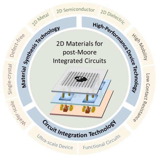 The use of 2D semiconductors in transistors pushes the boundaries of device miniaturization. Emerging gate-all-around FETs (GAAFETs) and complementary FETs (CFETs) exploit the unique properties of 2D materials to achieve unprecedented performance milestones in the international roadmap for device and systems (IRDS) [,,,,]. It also encompasses a reimagining of field-effect transistor (FET) design paradigms, as various transistor architecture leverage 2D materials for enhanced scalability and to address compatibility problems [,,]. As shown in Figure 1, the realization of the 2D material-based integrated circuits envisioned by IRDS necessitates large-area and defect-free 2D film growth technology, high-performance device manufacturing technology, and large-scale circuit design and integration technology.