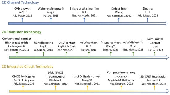 A chronological diagram showing the progress of 2D semiconductor channel technology [,,,,], transistor technology [,,,,,,], and circuit technology [,,,,].