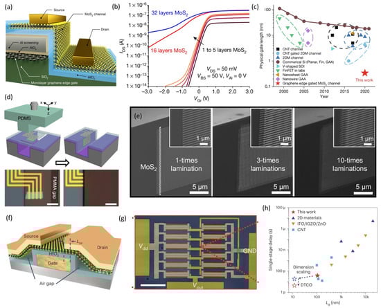 Ultra-scaled 2D FETs for the next-generation integrated circuits. (a) Schematic of sidewall gate structure with a monolayer MoS2 channel and a 0.34 nm monolayer graphene edge gate. (b) MoS2 thickness-dependent IDS–VGr curve in the simulated sidewall transistor. (c) Time scale evolution of Lg, highlighting Lg scaling down to the atomic limit with CNT, 2DM, GAA, and SOI. (reproduced with permission from [], Springer Nature, 2022). (d) Schematics and optical images of vertical lamination processes using a T-shape PDMS stamp laminated into the trench and the fabricated MoS2 vertical transistors post-lamination. (e) SEM images of vertical devices, with channel length and contact length fixed at 0.15 μm, channel width at 0.2 μm, source/drain electrodes at 20 nm thick Au, and an interlayer dielectric of 10 nm thick Al2O3. Insets show zoomed-in SEM images of vertical devices (reproduced with permission from [], Springer Nature, 2024). (f) Schematic of the device structure of the MoS2 FET with air gaps. (g) False-colored SEM image of a MoS2 ring oscillator (RO) and FET structure. (h) Comparison of single-stage delay versus Lg for ROs fabricated from different semiconductor technology, with the red star indicating the measured result of the MoS2 RO at Vdd = 3.1 V (reproduced with permission from [], Springer Nature, 2024).