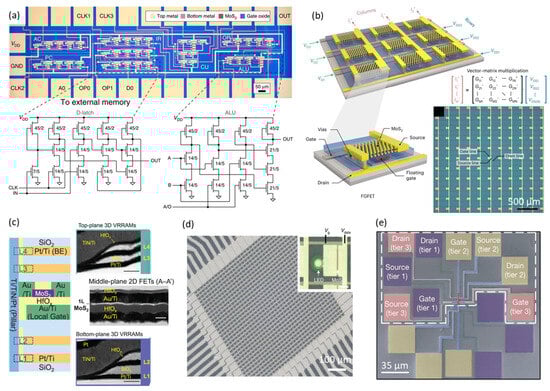Large-scale fabricated MoS2 FET array and circuit integration. (a) Microscope image of the microprocessor and the circuit schematics of a D-Latch and an ALU, with W/L ratio in units of μm/μm for each transistor (reproduced with permission from [], Springer Nature, 2017). (b) Three-dimensional rendering of MoS2 FGFETs in a matrix array, with gate and drain contacts organized in rows, source signal applied to columns, gate signals on the left, and drain signals on the right. The inset shows the optical image of the memory matrix and vector–matrix multiplication signal correspondence (reproduced with permission from [], Springer Nature, 2023). (c) Cross-sectional structure of the 1T–4R 3D VRRAMs, with insets showing the cross-sectional transmission electron microscope images of the top-plane VRRAMs (L3 and L4), the middle-plane 2D MoS2 FETs, and the bottom-plane (L1 and L2); the scale bars are 50 nm (reproduced with permission from [], Springer Nature, 2023). (d) Optical micrographs of the AM micro-LED display and inset showing the 1T1D pixel; the scale bar is 5 μm (reproduced with permission from [], Springer Nature, 2021). (e) Top view of false-colored SEM image of a three-tier 3D device stack, with color-coded contact pads (gate, source, and drain) representing tiers 1, 2, and 3 (reproduced with permission from [], Springer Nature, 2024).