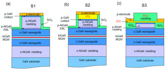 Figure 1 shows the schematic of blue LD structures used for the simulation of this study. The LD structures in Figure 1a–c correspond to the conventional GaN-based blue LD with a p-AlGaN cladding layer (S1), the LD structure with p-AlGaN and ITO cladding layers (S2), and the proposed LD structure with p-AlGaN, ITO, and SiO2 cladding layers (S3), respectively. Except for the p-cladding region, the epitaxial layer structures for S1, S2, and S3 are almost identical and similar to those employed in our previous studies [32,33]. The epitaxial layers are composed of a 1.2 μm thick n-type Al0.04Ga0.96N cladding layer, a 300 nm thick n-type GaN lower waveguide layer, a multiple-quantum-well (MQW) active region, a 200 nm thick GaN upper waveguide layer, a 10 nm thick p-Al0.2Ga0.8N electron-blocking layer (EBL), a p-type Al0.05Ga0.95N cladding layer, and a 20 nm thick p-type GaN contact layer. The active region consists of two 3 nm In0.15Ga0.85N QW layers separated by a 10 nm In0.02Ga0.98N barrier layer. For this MQW structure, the emission wavelength of the LD was 450 nm at 25 °C. The thicknesses of the lower and upper GaN waveguide layers were chosen to obtain a high optical confinement factor (OCF) and, consequently, a low threshold current could be obtained [32,34]. According to our previous simulation result, the Mg doping concentration of the p-AlGaN EBL and p-AlGaN cladding layers were set to 4 × 1019 and 2 × 1019 cm−3, respectively [30].