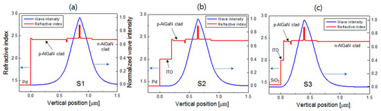 Vertical profiles of the refractive index (left vertical axis) and normalized wave intensity of the lasing mode (right vertical axis) for the LD structure. (a) S1 with the p-AlGaN thickness of 600 nm; (b) S2 with the p-AlGaN thickness and the ITO thickness of 200 nm; (c) S3 with the p-AlGaN thickness of 75 nm and the ITO thickness of 20 nm.