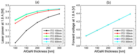 In Figure 6, laser power and forward voltage at 1.8 A are plotted as a function of the AlGaN thickness for ITO thicknesses from 100 to 300 nm. As the thickness of ITO or AlGaN increased, the optical loss by the Pd electrode decreased, resulting in an increase in SE and laser power. When the ITO thickness was above 200 nm, the laser power was almost invariant to the ITO thickness. This implies that the laser mode was sufficiently confined to AlGaN and ITO layers with little light absorption in Pd. As shown in Figure 6b, the forward voltage increased in proportion to the AlGaN thickness. However, it is almost independent of the ITO thickness, implying that the resistivity of ITO is negligibly small compared to that of the p-AlGaN cladding layer.