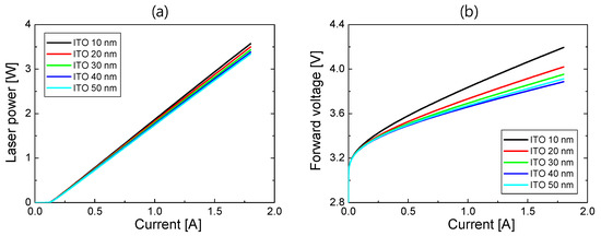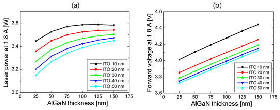 In Figure 9, laser power and forward voltage at 1.8 A are plotted as a function of the AlGaN thickness for ITO thicknesses from 10 to 50 nm. As the thickness of ITO increased, the optical absorption in the ITO layer increased, and hence, the laser power decreased. The laser power also decreased as the AlGaN thickness decreased, which is attributed to the increased laser mode intensity in ITO with the decreasing AlGaN thickness. The laser power at 1.8 A for a 10 nm thick ITO was as high as 3.58 W, which is a little higher than that of 3.44 W at 1.8 A for S2 with the 300 nm thick ITO. Since no optical absorption is associated with the p-type electrodes in S3, higher SE and, thus, laser output power could be obtained. As shown in Figure 9b, the forward voltage increased as the AlGaN thickness or the ITO thickness decreased. The dependence of the forward voltage on the AlGaN thickness is the same as in the cases of S1 and S2. The increase in the forward voltage with the decreasing ITO thickness resulted from the increased resistance in the thin ITO layer, as mentioned previously.