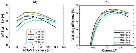 Combining the simulation results of the L–I and V–I curves for S2, WPE was calculated as a function of current. In Figure 7a, the WPE at 1.8 A is plotted as a function of the AlGaN thickness for ITO thicknesses from 100 to 300 nm. The WPE increased with the increasing ITO thickness, and it was almost the same for ITO thicknesses above 200 nm, as seen from the results in Figure 5 and Figure 6. When the ITO thickness was more than 150 nm, the highest WPE could be obtained at the AlGaN thickness of 150 nm, where the forward voltage and optical loss are well-balanced. Figure 7b shows WPE as a function of current for the AlGaN thicknesses from 100 to 300 nm when the ITO thickness is 300 nm. The WPE exceeded 45% when the injection current was >0.7 A, and the highest WPE was obtained at 47.5% when the AlGaN thickness was 150 nm. Compared to the WPE of S1, where the peak WPE was 39.5%, the WPE of the optimized S2 structure can relatively increase by ~20%.