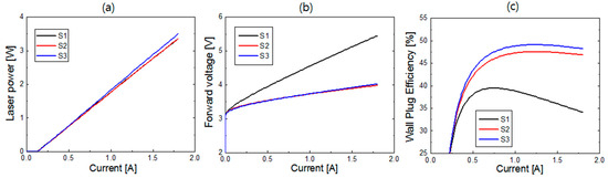LD device performances for the optimized structures of S1, S2, and S3. (a) L–I curves; (b) V–I curves; (c) WPE as a function of current.