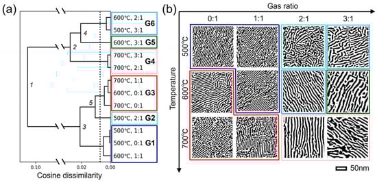 (a) Hierarchical clustering of Pt-CeO2 nanostructures with cosine dissimilarity calculated from zeroth vectorized PDs. The branch points are numbered as 1, 2, … in descending order of cosine dissimilarity. The dashed line is the threshold for clustering and is the maximum deviation calculated from the mean of cosine dissimilarity for the same set of synthesis conditions. The 12 nanostructures were finally clustered into six groups (G1–G6). (b) Binarized STEM images of Pt-CeO2 nanostructures surrounded by the colors corresponding to those of the six groups (G1–G6) in (a).