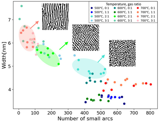 Figure 6 displays a scatter plot of the number of small arcs with the characteristic size and width of the CeO2 phases identified as the effective descriptors for 12 Pt-CeO2 nanostructures. The scatter plots clearly classify the various nanostructures synthesized under different conditions. The width (vertical axis) behaves like a scale factor, and the number of small arcs (horizontal axis) behaves as a descriptor of disorder. For comparison, the well-classified nanostructures synthesized at 500, 600, and 700 °C with a gas ratio of 2:1 are shown in blue, green, and red, respectively. As observed in the corresponding binarized STEM images (inset), while the nanostructures at the top left (red) are striped, those at the bottom right (blue) are maze-like, with more small arcs present in the samples formed at lower temperatures, as mentioned in Section 3.1. Notably, PCA could also classify the 12 nanostructures but provided little direct interpretability (Figure S10).