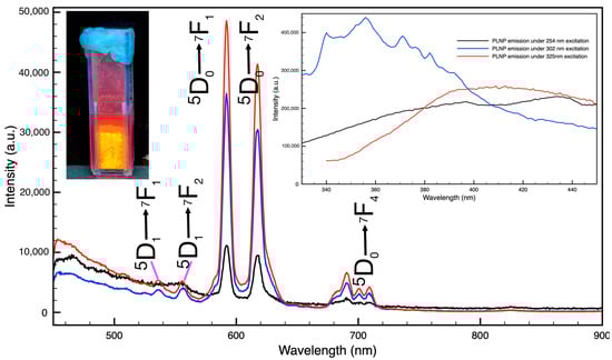 Emission spectra of LaAlO3: Eu, Zn PLNPs under 254 nm, 302 nm, and 325 nm. Left inset shows a visible image of the PLNPs in a cuvette under 302 nm excitation. Right inset shows emission in the 330–450 nm spectral window taken without the long-pass filter.