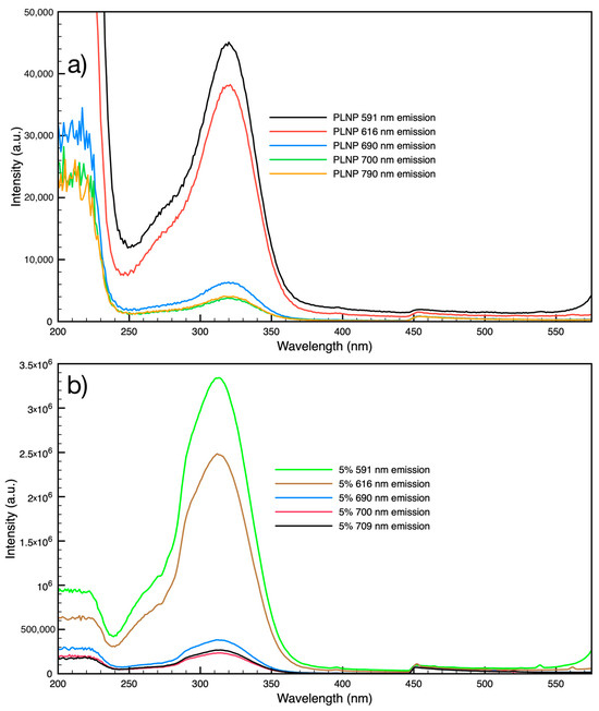 Excitation spectra for (a) PLNP powder sample emission peaks and (b) 5% PLNP-loaded filament emission peaks.