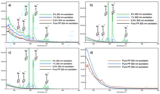 Emission spectra of PLNPs in extruded polypropylene filaments at different loading percentages under (a) 254 nm excitation, (b) 302 nm excitation, and (c) 325 nm excitation. (d) The emission of pure PP filaments under UV excitation.