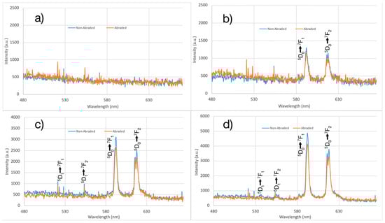 Emission spectra of abraded and non-abraded (a) pure PP sample filaments, (b) PP filaments with 0.5% PLNPs, (c) PP filaments with 1% PLNPs, and (d) PP filaments with 5% PLNPs.