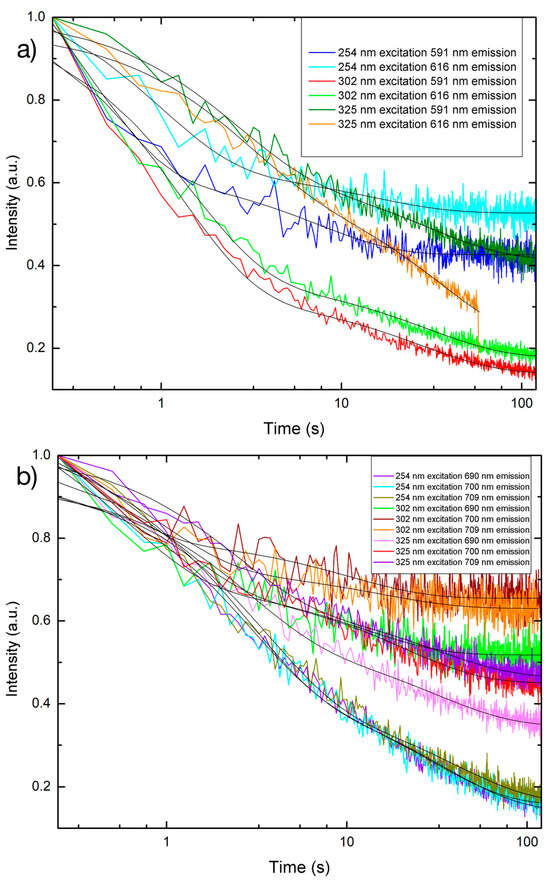 Semi-log plots of persistent luminescence decay curves for PLNPs in powder form for the (a) visible and (b) near-infrared regions. Black solid lines indicate the double-exponential decay fit.