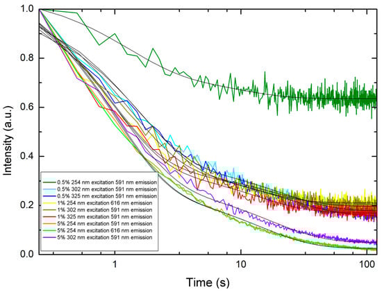 Semi-log plots of visible persistent luminescence decay curves for PLNP-loaded filaments. Black solid lines indicate the double-exponential decay fit.