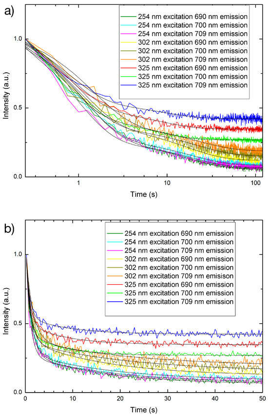 The duration of luminescence can determine the most appropriate applications for PLNPs with a longer duration of persistence usually being more desirable for commercial applications. Once the PLNPs are charged, they can emit energy for a long period of time without any external energy source. While investigating the persistent luminescence time dependence for the PLNPs in powder form under different excitation wavelengths (Figure 10 and Table 3), it was found that the length of persistent luminescence for each emission wavelength can vary depending on the excitation. The visible persistent luminescence had a decay constant that ranged from 7 to 35 s and was still visible for up to 120 s before it became too weak to detect. The NIR persistent luminescence lasted for 30–60 s, depending on which specific wavelength, and had a decay constant ranging between 10 and 40 s. The shape of the decay curve also suggests that the luminescent intensity value decreased more sharply within the first 30 s, and afterwards that the intensity decreased at a slower rate, indicating a double-exponential decay and agreeing with results from the literature [49].