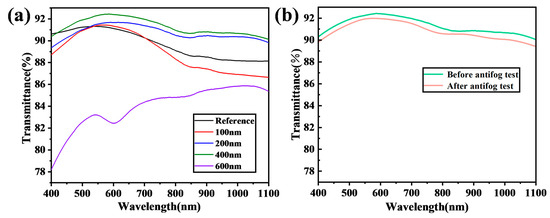 (a) Transmission of laser-ablated Cu-coated glass with various thicknesses (100 nm, 200 nm, 400 nm, and 600 nm) at a laser scanning rate of 1.0 m/s. (b) Transmission of ablated glass processed with a 400 nm Cu coating before and immediately after an antifog test.
