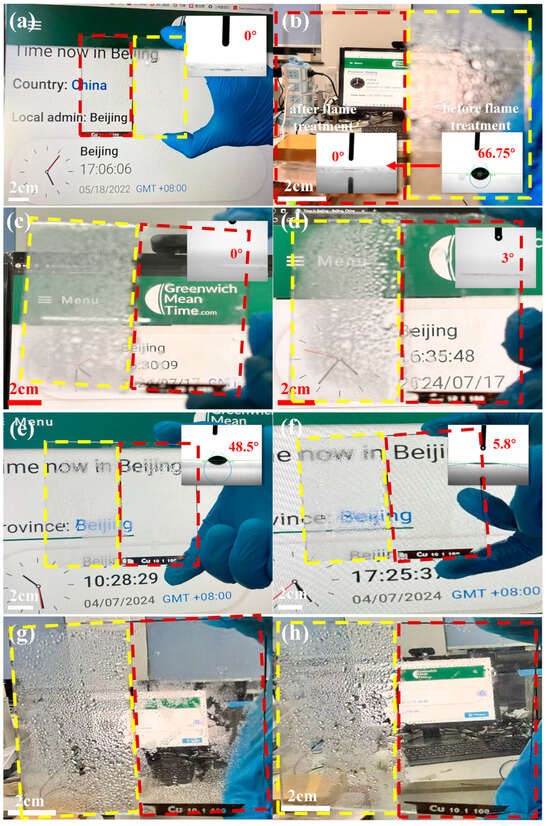 Figure 5a,b demonstrate the antifog images and contact angle characterization of a specially fabricated sample, which consists of half treated 400 nm-Cu sample and half control glass. The contact angle was only measured on ablated surfaces. The treated part showcased a remarkable antifog performance and superhydrophilicity in comparison with the reference glass, which is attributed to the micro-nano structure and surface chemical bonds. After 22 months of storage in the laboratory, the treated part lost its antifog performance. A 1 s flame treatment restored the antifog performance of the sample, reducing the contact angle from 67° to 0°, which was rarely reported in the field. Wiping with a wet cloth did not affect the antifog performance, but did increase the contact angle slightly to 3°. Figure 5e–h show the antifog images before and after a 5 min rapid annealing treatment at 400 °C for a sample consisting of half treated 200 nm-Cu sample and half reference glass. Figure 5e,g illustrate a substantial degradation in the antifog effect of the treated portion after 6 months of storage in the laboratory. However, the antifogging performance of the sample was successfully restored after a 5 min 400 °C treatment, with the text behind the glass becoming clearly visible during the antifog test. Figure 5f,h demonstrate that the contact angle decrease from 48.5° to 5.8° after a 5 min 400 °C treatment.