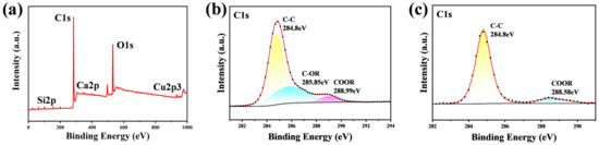 XPS spectra of the 400 nm-Cu sample. (a) Full spectrum (after flame treatment); (b) C1s region in (a); (c) C1s region in Figure 3a.