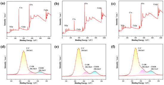 XPS spectra of a 400 nm-Cu sample subjected to different processing treatments. (a) Full spectrum after storage in the laboratory for approximately one year; (b) full spectrum of the sample in (a) after undergoing flame treatment; (c) full spectrum of the sample in (a) after undergoing rapid thermal annealing; (d) C1s region for the sample in (a); (e) C1s region for the sample in (b); (f) C1s region for the sample in (c).