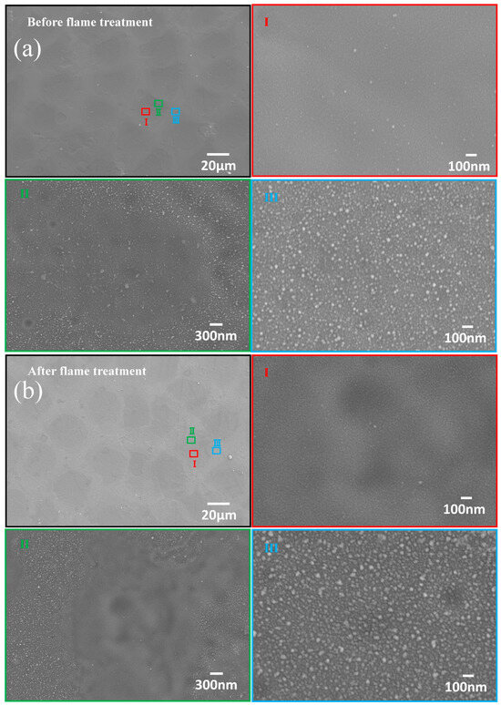 SEM images of a representative sample before and after flame treatment. (a) Before flame treatment; (b) after flame treatment.