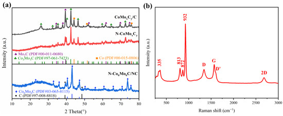 (a) XRD patterns of CoMoxCy/C, N-CoMoxCy, and N-Co6Mo6C/NC. (b) Raman spectra of N-Co6Mo6/NC.