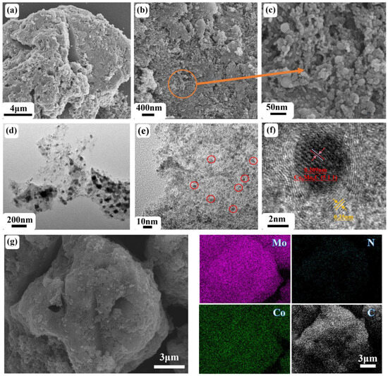 Structure and morphology of the N-Co6Mo6C/NC. (a–c) SEM images, (d–f) HRTEM images, (g) SEM image and EDX elemental mapping of Mo, N, Co, and C.