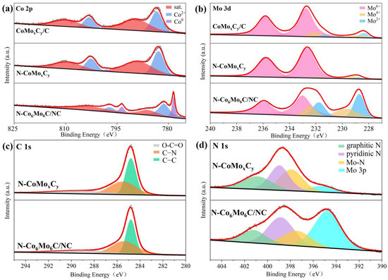 X-ray photoelectron spectroscopy (XPS) was employed to chemically characterize the elements present in various catalysts, as shown in Figure S4. The XPS survey spectra revealed the presence of five elements: O, C, N, Co, and Mo. In the Co 2p spectrum of N-Co6Mo6C/NC (Figure 4a), the peaks at 781.33 eV and 797.17 eV correspond to the Co 2p3/2 and Co 2p1/2 states of oxidized Co species, respectively, with their satellite peaks located at 786.14 eV and 803.03 eV. The double peaks of Co0 at 778.58 and 793.65 eV correspond to the Co 2p3/2 and Co 2p1/2 orbitals of Co-Co [43,44]. The high-resolution Mo 3d XPS spectrum of N-Co6Mo6C/NC (Figure 4b) indicates that the peak at 228.72 eV and 231.77 eV corresponds to Mo2+, suggesting the presence of a Mo-C bond and the formation of molybdenum carbide [43]. The Mo2+ binding energies in N-Co6Mo6C/NC and N-CoMoxCy (228.78 eV, 231.81 eV) are higher than that in CoMoxCy/C (228.37 eV, 231.34 eV), indicating an increase in Mo-C binding energy upon N incorporation. The peaks at 229.68 eV and 232.43 eV are attributed to Mo4+, while the peaks at 233.02 eV and 235.94 eV can be attributed to Mo6+. The deconvoluted C 1s spectrum (Figure 4c) reveals peaks corresponding to the C–C bond at 284.8 eV, the C–N bond at 285.4 eV [45], and the O–C=O bond at 288.8 eV. The disappearance of the C=C bond in CoMoxCy/C and its transformation into the C–N bond in N-Co6Mo6C/NC and N-CoMoxCy confirms the N incorporation [46]. The N 1s spectrum (Figure 4d) shows deconvoluted peaks at 397.35 eV, 398.76 eV, and 401.06 eV, corresponding to Mo-N, pyridinic N, and graphitic N, indicating the uniform doping of N atoms within the carbon matrix [47]. The shoulder peak at 394.72 eV is attributed to the binding energy of Mo 3p. The Mo-N and C-N bonds in the matrix are formed via reactions between Mo and CNx species generated during the subsequent carburization process. Notably, pyridinic N is the dominant N species, playing a crucial role in the HER process, where it can attract electrons and activate hydrogen via single-electron pairs [8,48]. These results strongly confirm the N doping on graphene achieved during the annealing process and the distribution of Co6Mo6C on graphene.