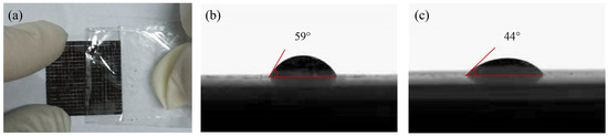 The viscosity and surface tension of nano-copper paste are two important physical properties that have an important effect on the application performance of nano-copper paste. As for the viscosity of the nano-copper paste, 3 M tape was pasted on the surface of the copper film, and the tape was quickly pulled apart after compression, as shown in Figure 1a. The adhesion of the nano-copper paste to the substrate was detected by observing the spalling of the coating in the grid. After a 3 M tape test, the spalling area of the sample was 0.358%, and the adhesion between the copper paste and the substrate reached 4B standard and met the application requirements. We used the contact angle to represent the surface tension of the nano-copper paste. The measurement results showed that, as shown in Figure 1b,c, the contact angle between the nano-copper paste and the substrate was 59° when PVP was not added; after PVP was added, the contact angle between the nano-copper paste and the substrate was 44°, the contact area between the nano-copper paste and the plane increased, and the contact angle decreased. Nano-copper paste can better wet the substrate.