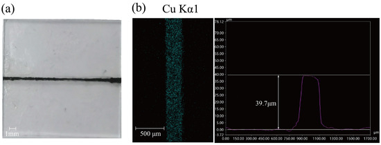 Inkjet printing was used to continuously deposit copper nano-ink onto a glass substrate, resulting in the formation of copper paste lines measuring 2 cm × 250 μm × 40 μm. Subsequently, a three-dimensional digital microscope was employed to perform contour scanning of the printed ink lines, and the scanning image is depicted in Figure 2. As a printing ink, copper nanoparticles should have good dispersion in the solvent, and their adhesion should meet the 4B standard. JETLAB 4, a nanomaterial deposition inkjet printing system from MICROFAB Technologies, Plano, TX, USA, was used.