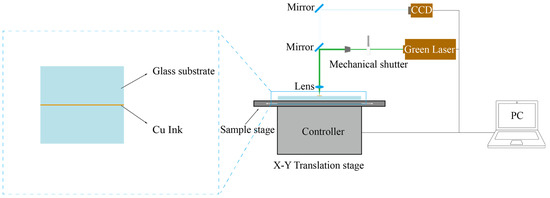 In this study, the sintering of nano-copper paste is carried out in the air. In order to prevent the oxidation of nano-copper, PVP is added to the nano-copper paste. PVP can not only be used as a dispersant but also be coated on nano-copper particles to prevent the oxidation of nano-copper particles. These decomposition products have a certain reducibility in sintering and can be nano-copper oxides such as cuprous oxide and copper oxide reduced to copper. During the experiment, the prepared sample was installed on the X-Y translation platform, a 532 nm continuous green laser with the maximum output power of 15 W was used as the light source, the CCD camera was connected to the computer, and the protection gas was turned on to observe the sintering process of the laser in the experiment. Different laser parameters (laser power density, scanning speed, scanning times) were used to carry out the sintering experiments, and the effects of laser power, scanning speed, and sintering times on the porosity and conductivity of sintering lines were compared. The schematic diagram of the experimental device is shown in Figure 3. After focusing, the spot diameter is 50 μm, and the laser scanning speed is controlled by the X-Y mobile station.