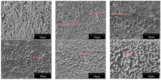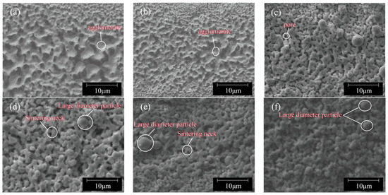 When the speed reaches 200 mm/s, large particles are formed based on the migration and agglomeration of smaller particles. Figure 7f demonstrates particle growth occurring with coarsened particles covering the sintered line surface. There is no direct neck formation and densification from one particle’s surface to another; instead, coverage primarily consists of large particles.