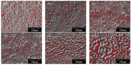 The microscopic morphology of sintered lines is a critical factor influencing their electrical conductivity [18]. In order to further illustrate the relationship between the sintered surface morphology of copper paste and its electrical properties, ImageJ software was used to process the SEM images of the sintered samples. Based on the differences in brightness and darkness within the images, pores were filled with red pixels. The processed images are shown in Figure 5.