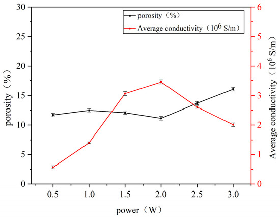 Using ImageJ1.54j software, the porosity of the processed images was calculated to determine the area percentage of pores in each image. The resistivity values of the sintered lines under different laser powers were measured at room temperature using the four-point probe method, with three measurements taken for each sample and averaged. Subsequently, conductivity was calculated using Equation (1). The relationships between porosity, conductivity, and laser power are illustrated in Figure 6.