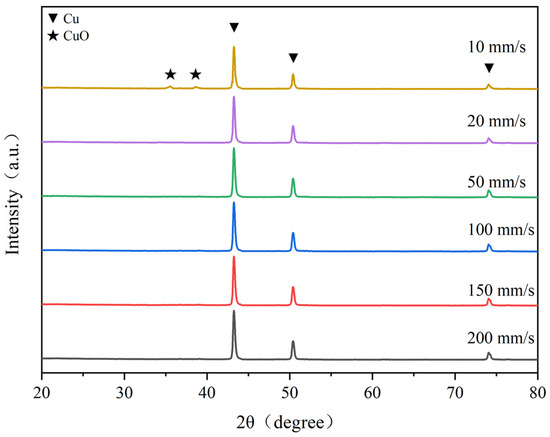Laser sintering is a rapid heating process, where the sintering speed determines the sintering time, which in turn affects the amount of laser energy absorbed by the material. Therefore, the laser scanning speed is also a critical parameter influencing sintering quality. Under the conditions of a fixed laser power of 2 W and a single sintering pass, experiments were conducted by adjusting the laser scanning speed to 10 mm/s, 20 mm/s, 50 mm/s, 100 mm/s, 150 mm/s, and 200 mm/s. The surface micro topographies of sintered lines at different laser scanning speeds are shown in Figure 7. It can be seen from the SEM diagram that when the nano-copper paste is sintered at the speed of 10 mm/s, the copper nanoparticles on the surface of the sintering line have been sintered into blocks and completely sintered together. This is because when the laser scanning speed is slow, the sintering time is longer under the same laser power, and the sintering temperature is higher with the accumulation of heat. The copper nanoparticles melt and combine into larger particles, and form uneven gaps after cooling and solidification. As shown in Figure 8, the oxidation peak appears at this time, which may be due to the thermal decomposition of PVP covered by the surface of copper nanoparticles during the sintering process, and the exposure of copper nanoparticles to air leads to a slow sintering speed and longer exposure to air, resulting in more copper oxide; however, alcohol and acid after PVP decomposition are not enough to completely reduce the generated copper oxide to copper. The oxidation peak disappears when the speed increases, and this may be because, during the sintering process, PVP coated on the surface of copper nanoparticles encounters thermal decomposition, exposing copper nanoparticles to air, increasing the sintering speed, shortening the exposure time of copper nanoparticles to air, and reducing the generated copper oxide. The alcohol and acid after PVP decomposition will completely reduce the copper oxide to copper.