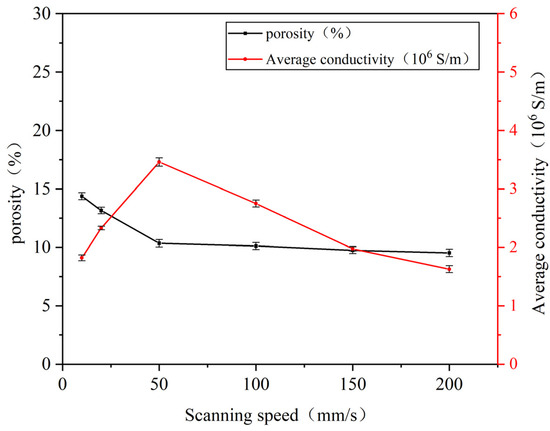Relationship between porosity and electrical conductivity of sintered lines versus laser scanning speed.