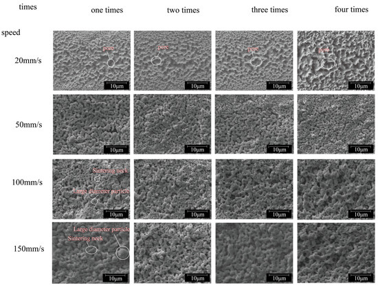 The microstructure of the line after multiple sintering at different scanning speeds is shown in Figure 10. It can be observed from the microscopic topography that when the scanning speed is 20 mm/s, the surface topography formed on the sintering line becomes coarser with an increase in laser scanning times. This effect is especially pronounced when the laser sintering is continuous for four times, leading to significantly larger pores on the sintering surface compared to the first time. It is evident that at low scanning speeds, heat accumulation resulting from multiple scans promotes pore enlargement. When the speed is 50 mm/s, the laser-induced heating behavior drives the formation of the neck when the repetition is one to two times, and the sheet mesh structure begins to diffuse, which dominates the diffusion and increases the degree of densification. When the number of scans is increased by three to four times, the heat obtained by the nanoparticles accumulates, making the particles further melt and solidify. When the speed increases to 100 mm/s and 150 mm/s, after a single laser scan, necks form between small copper nanoparticles and become interconnected. However, many un-sintered particles remain on both the surface of the copper paste layer and within the film. With an increase in scanning times, although the network structure spreads out, an under-sintering phenomenon does not significantly improve, and densification remains inadequate.