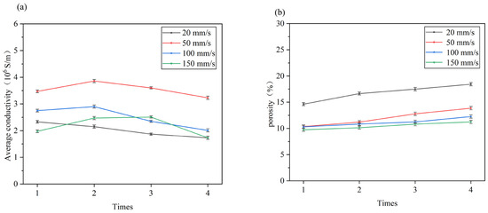 At different scanning speeds, (a) the relationship between electrical conductivity and sintering times. (b) The relationship between porosity and sintering times.