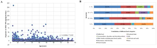 (A) The scatter plot of age and TiO2 NP exposure in the Chinese population. The linear regression curve equation was given as y = −0.1006x + 7.3345. (B) The contribution of different food categories to TiO2 NP exposure in various age groups. Puffed food and powdered drinks were identified as the primary dietary sources.