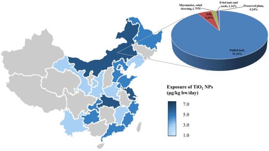 3.4. Age and Regional Distribution and Food Contribution of TiO2 NP Exposure