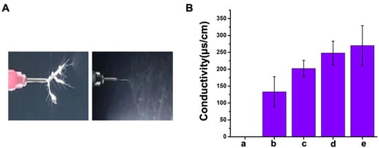 (A) Effect of fast-evaporating solvents on conical-shaped polymeric droplet during electrospinning and stable Taylor cone formation with control of T and RH in the chamber. (B) Conductivity of (a) 10% PCL, (b) 1% PCL/SS-PVA-CIP (3.0 μg/g), (c) PCL/1% SS-PVA-CIP (7.0 μg/g) (d) PCL/2% SS-PVA-CIP (3.0 μg/g), and (e) PCL/2% SS-PVA-CIP (7.0 μg/g). Data illustrates mean ± SD, n = 3.